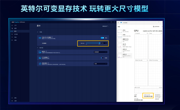 也就是说,如果你的系统内存为128GB,最多可以共享120GB作为显存,96GB系统内存则能共享90GB,这是其他厂商都做不到的。