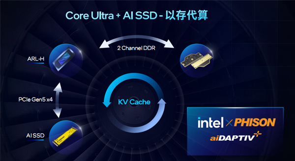 Intel与群联电子共同将aiDAPTIV+技术与酷睿Ultra 200H系列处理器结合,通过PCIe 5.0 AI SSD实现"以存代算",显著加速模型推理。