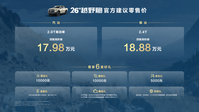 随着新车的上市,官方还发布了一系列的购车权益。其中:2026款商用炮用户可享6000元现金礼、5000元置换礼、3000元老友礼以及金融礼、服务礼五重大礼;2026款乘用炮可享受6000元现金礼、5000元置换礼、3000元老友礼以及金融礼、服务礼、互联礼六重大礼;2026款越野炮用户则可享10000元现金礼、10000元置换礼、5000元老友礼以及金融礼、服务礼、互联礼六重大礼。