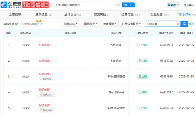 企查查APP显示,三只松鼠股份有限公司成立于2012年2月,法定代表人为章燎源,注册资本约4亿元,由章燎源、NICE GROWTH LIMITED、安徽燎原投资管理有限公司等共同持股。章燎源为公司创始人,并担任董事长、总经理、董事职务,在公司中叫松鼠老爹。企查查显示,三只松鼠已申请注册多个松鼠老爹商标,国际分类包括医药、服装鞋帽等。