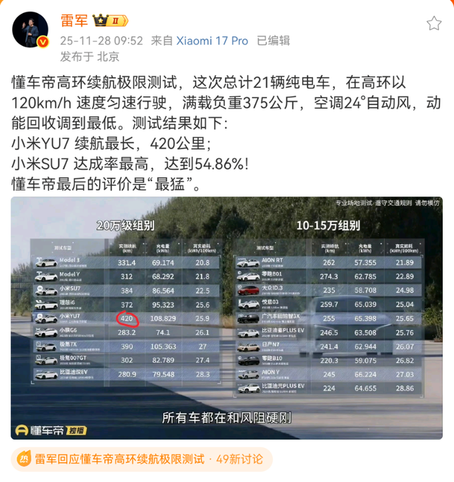 11月28日,雷军在微博分享了懂车帝的高环续航极限测试结果。本次测试共有21辆纯电车参与,在北京10℃环境下,以120km/h速度匀速行驶,满载负重375公斤,空调24度自动风,动能回收调到最低。