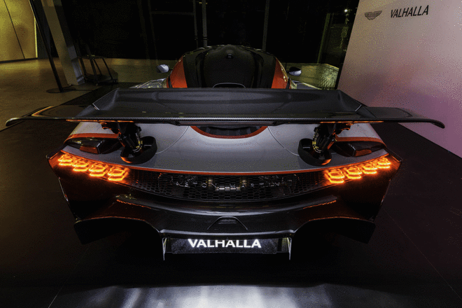 车尾方面,阿斯顿·马丁Valhalla量产版摒弃了固定翼设计,配备超大尺寸扰流板,其角度也可随车速调整,类似于F1赛车开启“DRS”的原理,在车速达到240公里/小时时,可产生超过600公斤的下压力,随着车速提升至最高时速350公里/小时,主动空气动力学系统会逐步降低前后翼的“迎角”,“释放”多余的下压力,以维持下压力水平,最大限度地增强驾驶员的信心。同时,新车采用四出钛合金排气系统,一对排气管位于车顶,另一对排气管则位于车身底部通道两侧,其下置排气管由主动阀控制。