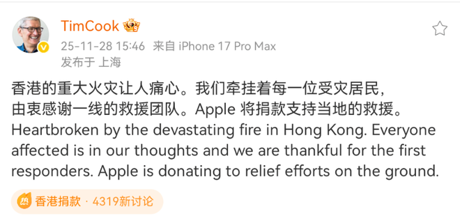 11月28日,苹果公司CEO蒂姆·库克发文表示,Apple将捐款支持香港大埔火灾救援。库克称,香港的重大火灾令人痛心,Apple牵挂着每一位受灾居民,并对一线救援团队表示感谢。
