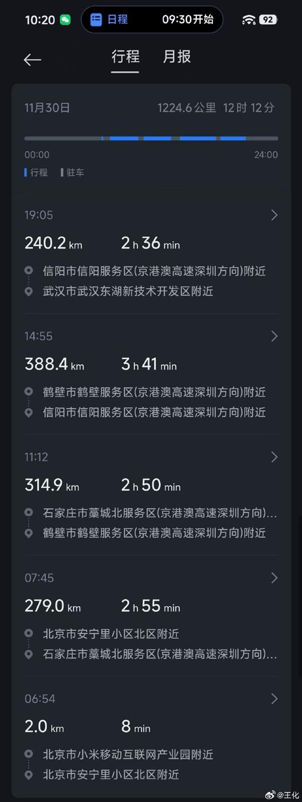 今天上午,王化晒出自己赴武汉上任的行程。11月30日,他驾驶小米SU7 Max从北京出发,历经12小时12分钟,完成了1224.6公里的长途驾驶,最终抵达武汉。