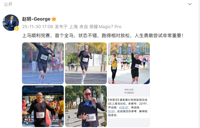 11月30日,荣耀前CEO赵明晒出了完赛上海马拉松的照片,“上马顺利完赛,首个全马,状态不错,跑得相对放松,人生勇敢尝试非常重要!”