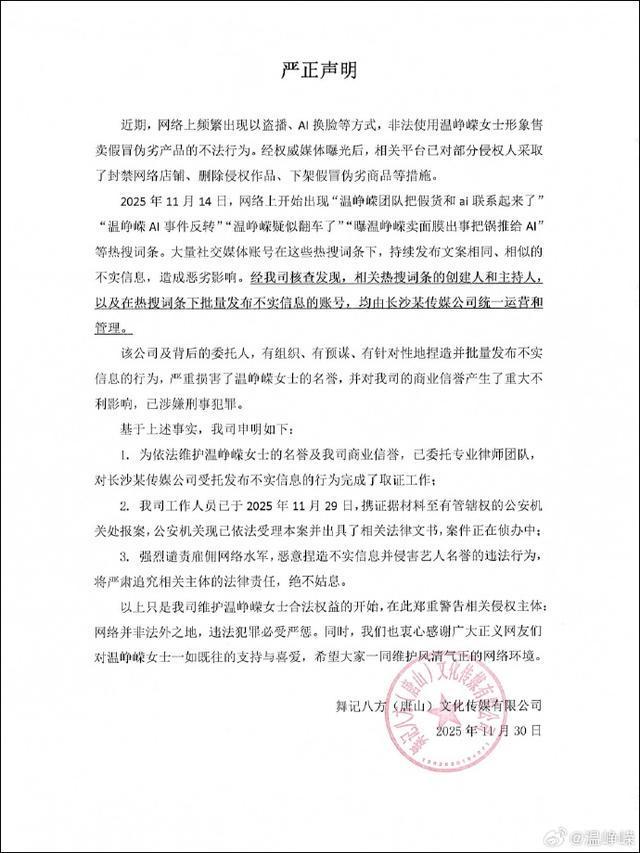 刚刚,温峥嵘发文称已报警立案,并晒出受案回执。声明称大量社交媒体账号在这些热搜词条下,持续发布文案相同、相似的不实信息,造成恶劣影响。相关热搜词条的创建人和主持人,以及在热搜词条下批量发布不实信息的账号,均由长沙某传媒公司统一运营和管理。