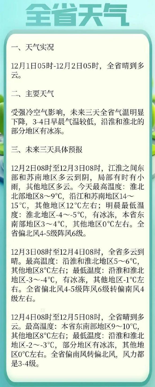 【受强冷空气影响,未来三天全省气温明显下降,3-4日早晨气温较低,沿淮和淮北的部分地区有冰冻】