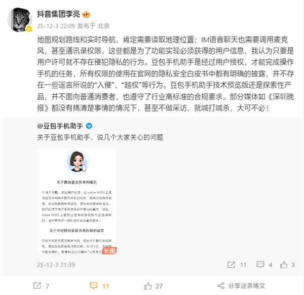豆包手机助手官微对此已经发布了正式回应,抖音集团副总裁李亮也转发了回应,并回应了一些问题: