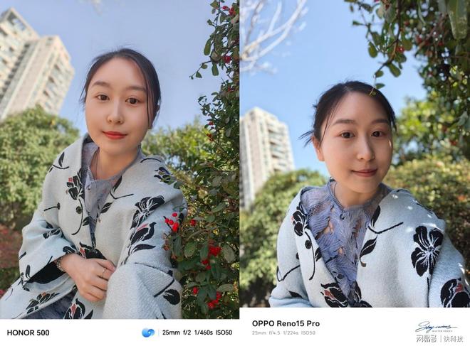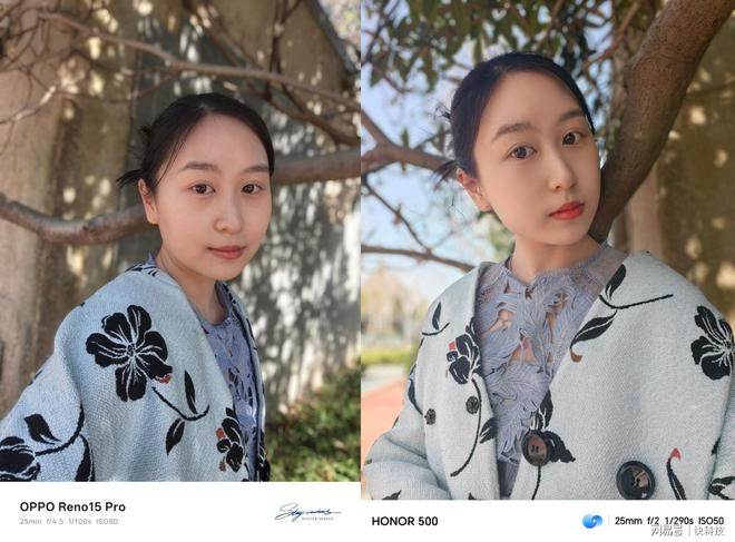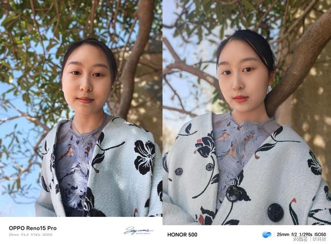 几张人像对比,为了减少人像位置姿势频繁调换造成的质量差异,同时荣耀500和500 Pro的前置相机配置也相同,我们使用直接使用荣耀500来和Reno 15 pro对比。