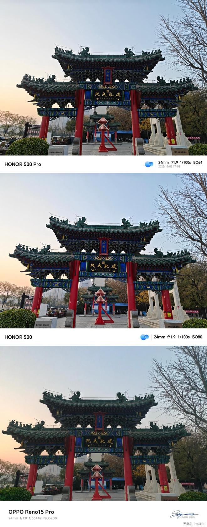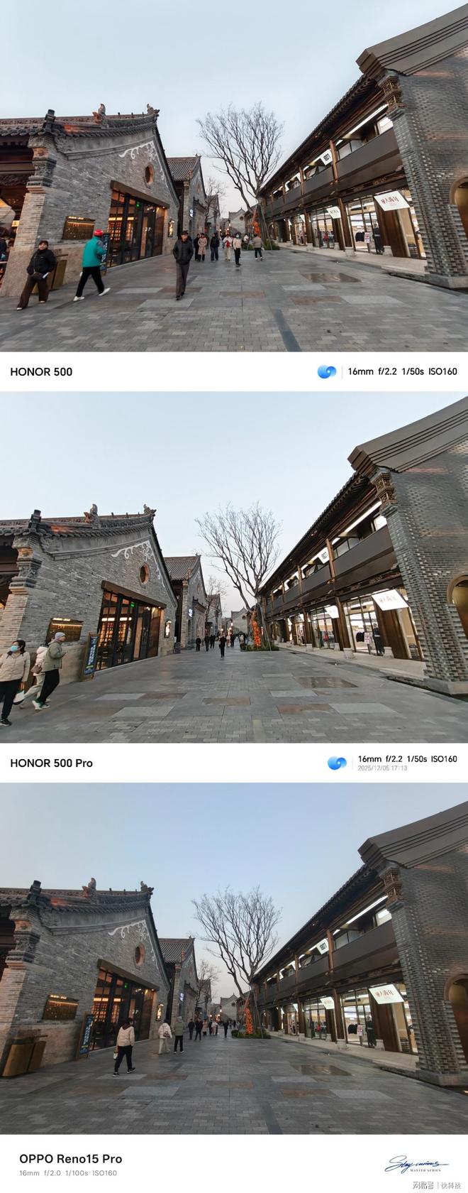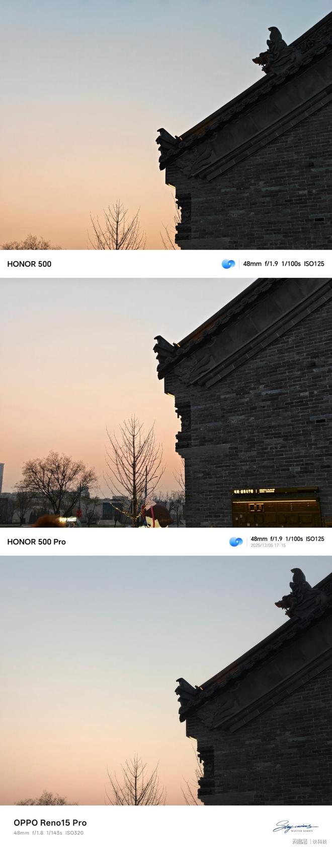 这张黄昏图中,Reno 15 Pro的差距之大,已经荣耀500系列的两台被彻底甩开了,右侧建筑上砖块细节的几乎不可见。