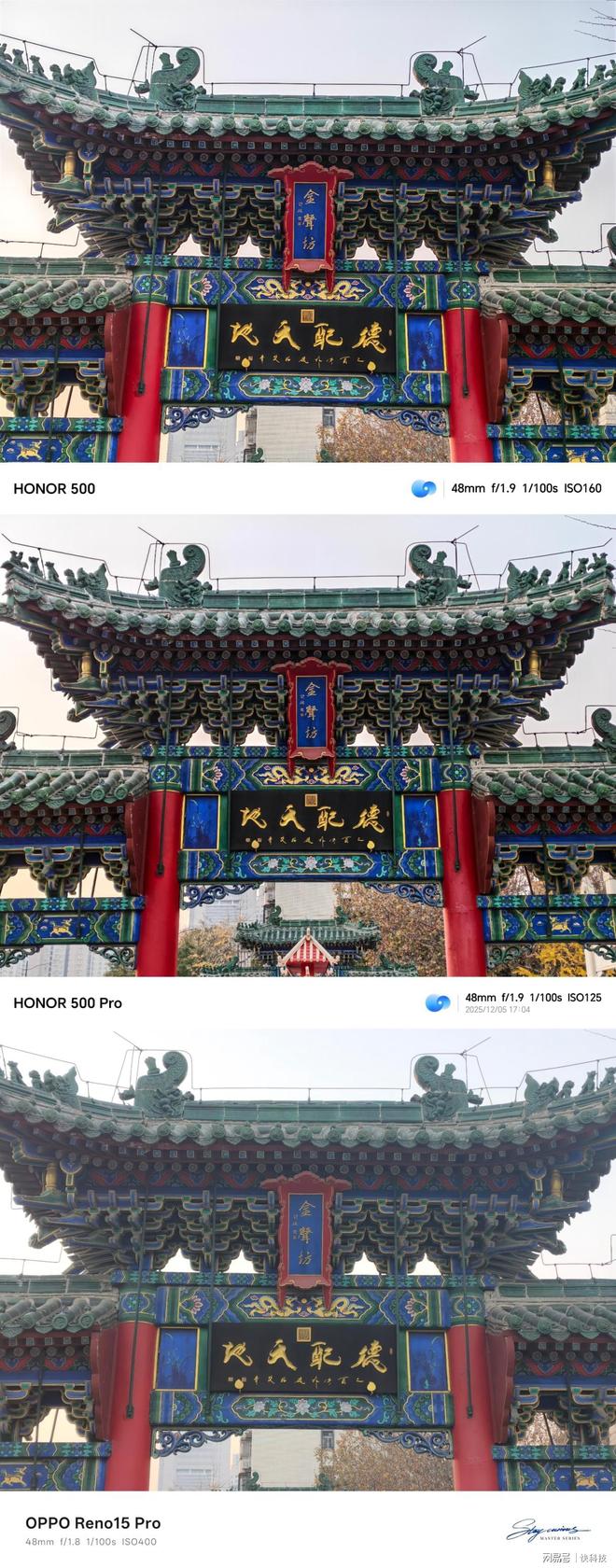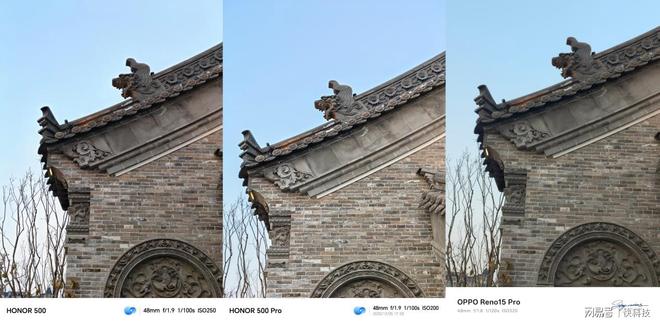 再来看看这张同一位置的二倍裁切,在全默认的情况下,Reno 15 Pro的照片有明显的发淡发白,而荣耀500的两张则极有质感,饱和度高。