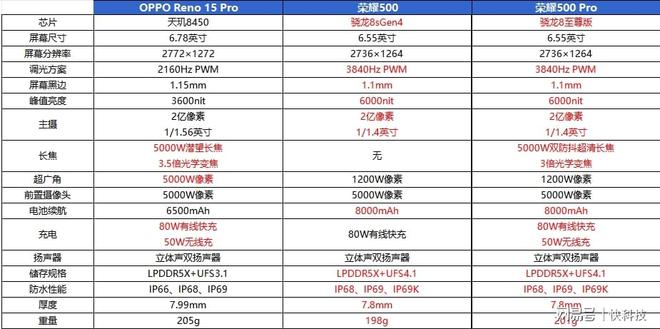 我们用一张具体的配置图来展现其荣耀500系列与Reno 15 Pro的具体参数。