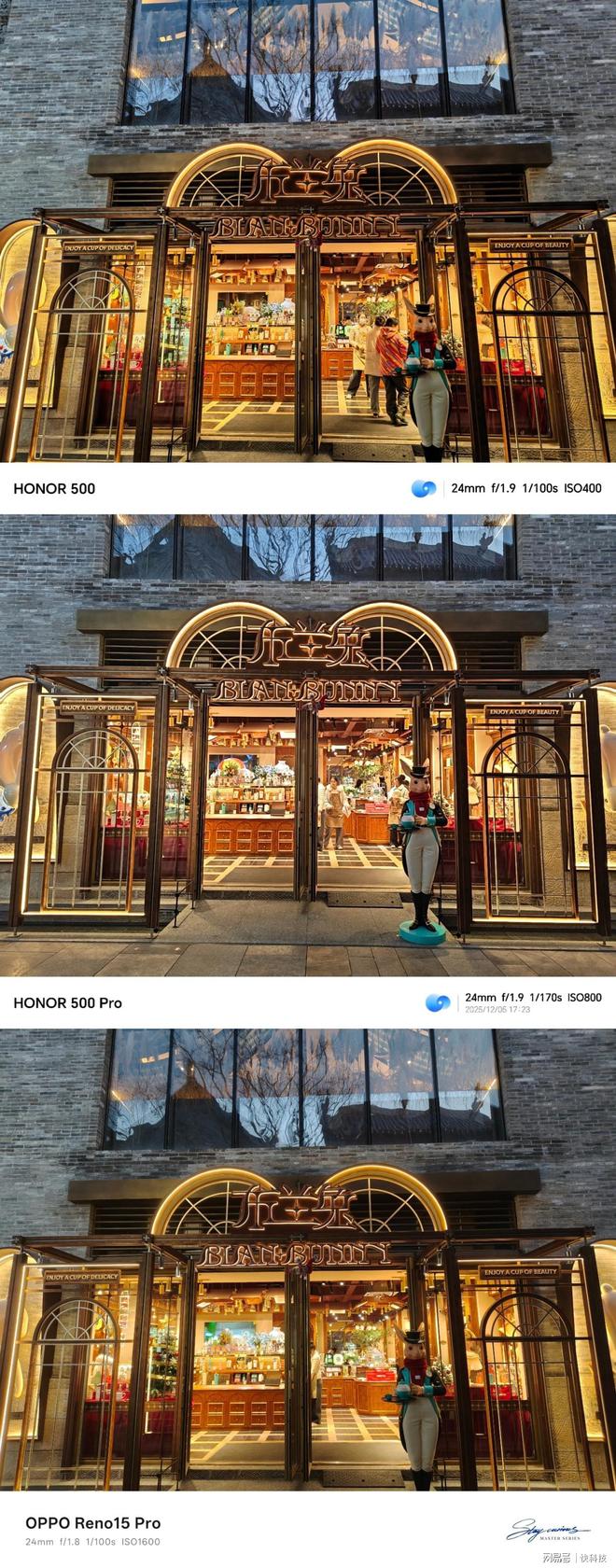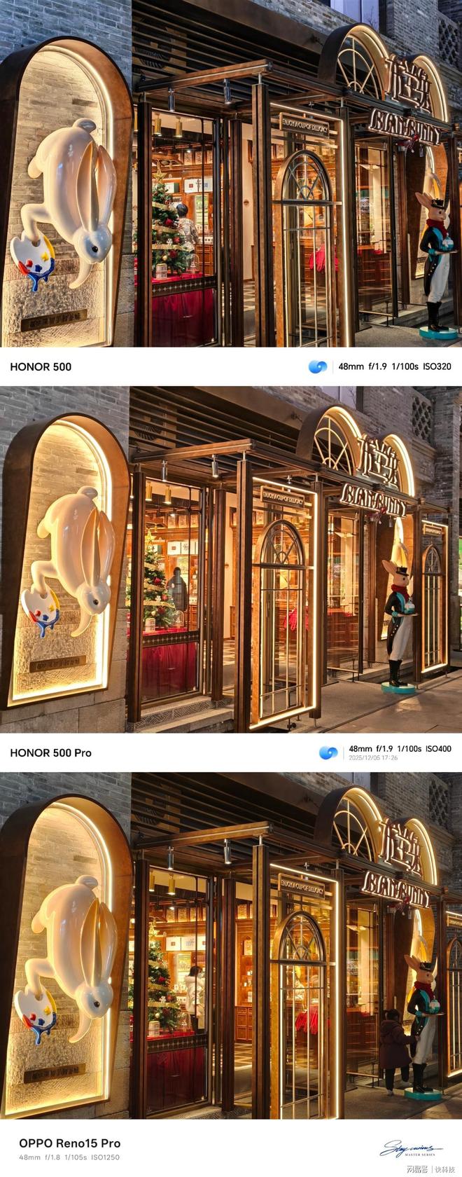 我们再来看看夜景下的对比表现,荣耀500系列的广告牌灯光控制得非常好,一点没有过曝的表现。右侧的兔子细节展示也比Reno 15 Pro要更好,不过Reno的比较暗反而有些特殊质感。