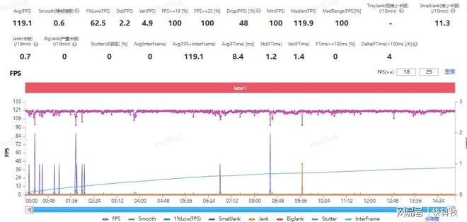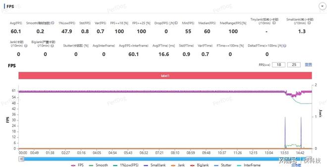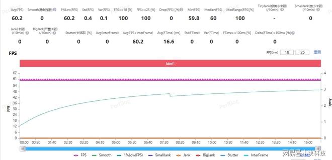 而在原神中跑图,平均帧数60.1FPS,稳帧指数0.2,1%low帧47.9FPS,在测试的最后时刻有些掉帧,但是很快就回归正常。