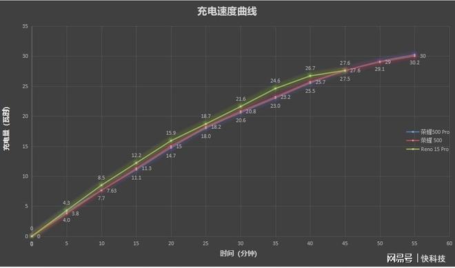 而荣耀500系列虽然充电速度稍慢,但也紧随其后,在45分钟时,其总充入量与Reno 15 Pro相当接近,最终在55分钟时完成充电。