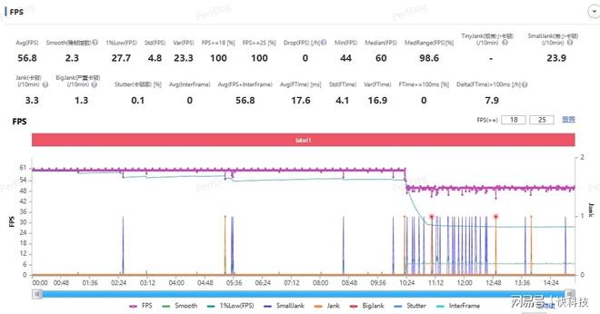 而OPPO Reno 15 Pro在测试中出现了锁帧的现象,在10分钟后开始锁定为了50帧。最后结束是56.8FPS的平均帧。稳帧指数2.3,27.7FPS的1%low帧。
