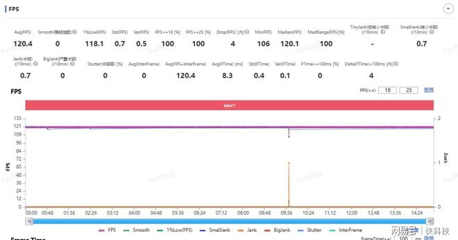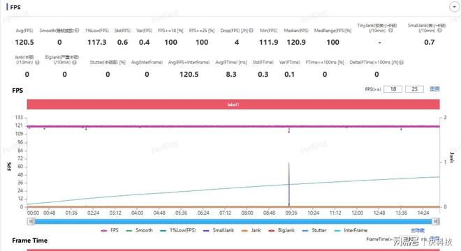 在我们一局游戏回放中,开启幻影稳帧,荣耀500系列的平均游戏帧数都达到了120帧以上,稳帧指数均为惊人的0!,1%low帧在115帧以上,这是绝对的超满帧。