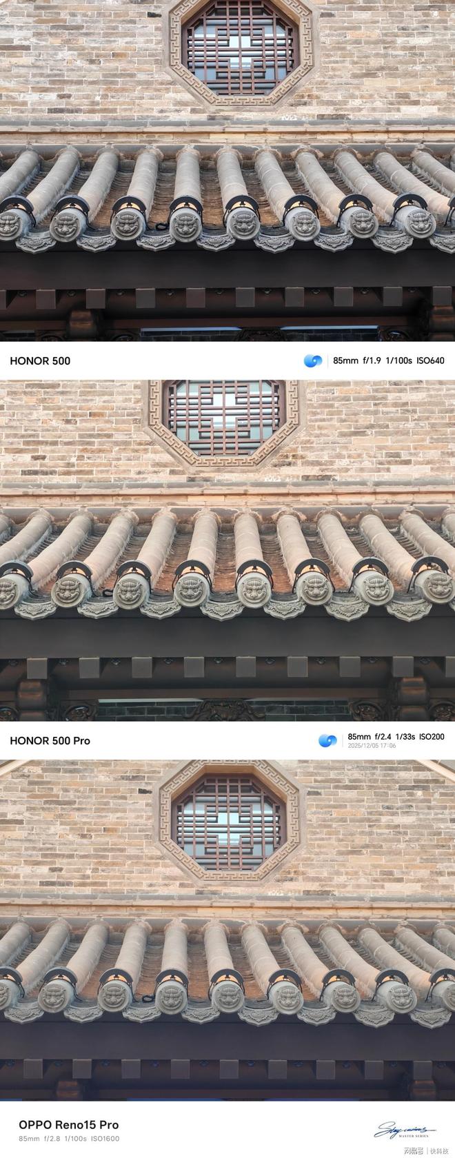 我们首先来看一张主摄直出对比,可以很明显的对比出来,荣耀500系列的的两张的动态范围显示效果更好,暗处细节相比Reno要多得多。