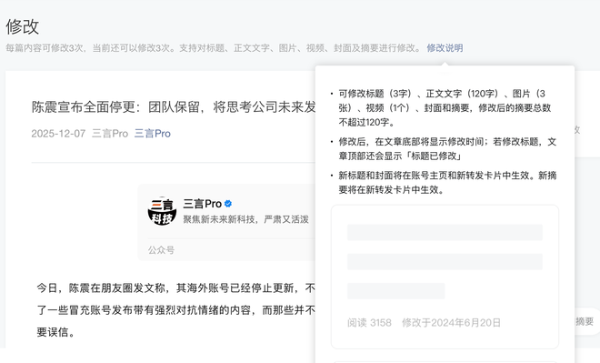 三言发现,微信公众号文章可修改机会已从1次增加到3次,可以对标题、正文文字、图片、视频、封面及摘要进行修改。