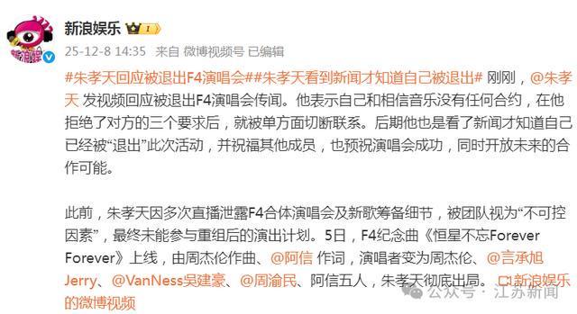 此前,朱孝天因多次直播泄露F4合体演唱会及新歌筹备细节,被团队视为“不可控因素”,最终未能参与重组后的演出计划。