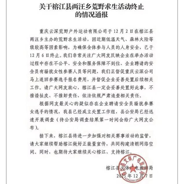当天,榕江县文体广电旅游局发布通报称,就广大网友反映比赛中存在不公平、安全和服务保障不到位等问题,他们正督促重庆云深公司马上退回参赛选手报名费用,并督促企业妥善处置后续相关工作。对疑似安全员骚扰参赛女选手的情况,县政府已经成立处置工作组,县公安局已经迅速开展调查。