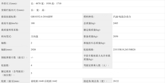 车身尺寸方面,新车长宽高分别为4870/1930/1710mm,轴距达到2920mm,接近中大型SUV水平,为五座布局提供充裕空间。