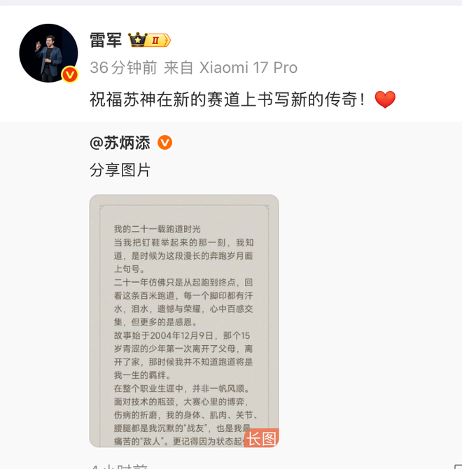 12月9日,雷军转发苏炳添官宣退役博文,并表示:祝福苏神在新的赛道上书写新的传奇。