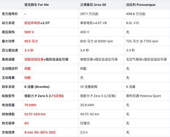 莲花For Me,在市场上能够与之抗衡的无外乎法拉利Purosangue和兰博基尼Urus SE了,而它们也是曾经的超跑SUV标杆典范,但如今,无论是动力操控还是续航和补能,它们都椅背莲花For Me所超越,就包括莲花For Me所拥有的900V架构,也是远远领先于兰博基尼 Urus SE的。