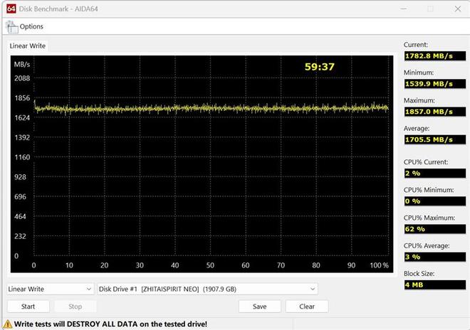 更关键的是,在1个小时的时间内,都没有出现降速的情况,最高写入速度1857MB/s,最低1539MB/s、平均写入速度1705MB/s。