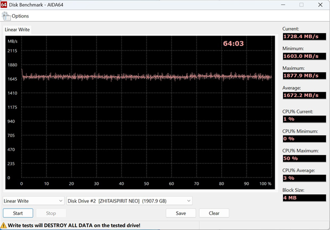 AIDA64 Disk Benchmark Linear Write用于测量在没有文件系统干扰下,SSD的持续写入速度和稳定性,它能够最直观地展示SSD的真实的缓外速度。