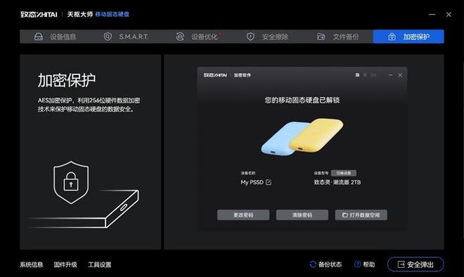 另外长江存储还开发了致态天枢大师移动固态硬盘管理软件、致态加密软件及致态备份管家APP,可提供硬盘管理、数据加密、文件/照片备份等功能。