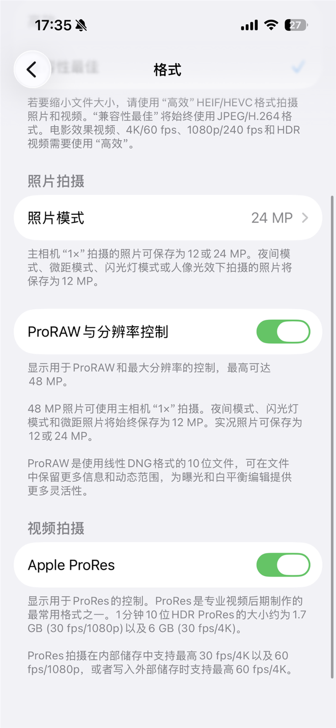 我们在拍照设置汇中打开"Apple ProRes",同时选择"HDR编码"。