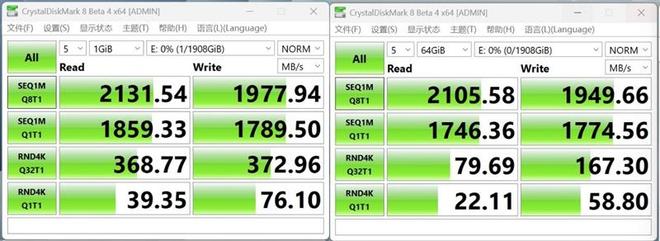 右边是64GB的测试,顺序读取速度2105MB/s、写入1949MB/s,4K随机读取22MB/s、写入58MB/s。