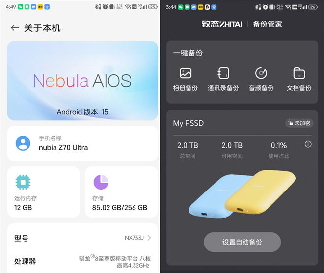 这是努比亚Z70 Ultra手机搭载的Andriod 15系统,可以完美识别致态灵·潮流版移动固态硬盘,并且使用"致态备份管家"app来备份手机数据。