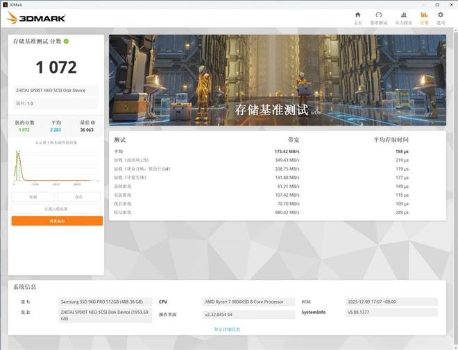 3DMark存储测试主要是测试游戏读写表现,总分是1072分,延迟158微秒,移动游戏带宽980MB/s。