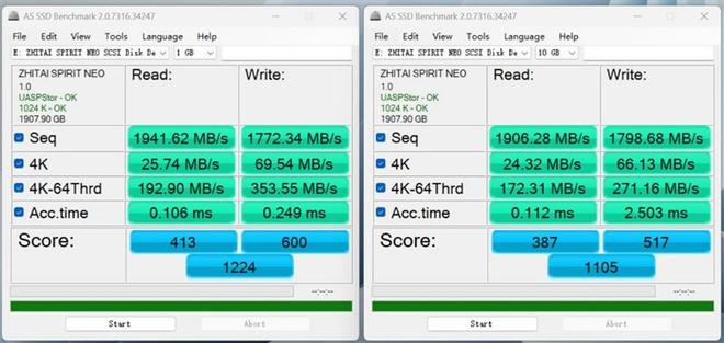 左边是1GB容量的测试。在AS SSD Benchmark的测试中,致态灵·潮流版移动固态硬盘2TB得分为1224分。顺序读写速度分别为1941MB/s、1772MB/s,4K读写速度则是25MB/s、69MB/s。