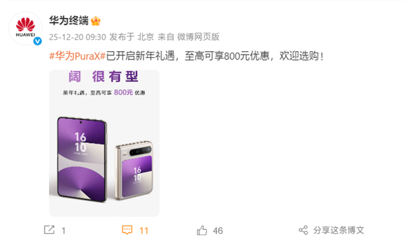 12月20日消息,华为官方今天正式宣布,华为Pura X开启新年礼遇活动,至高优惠800元。