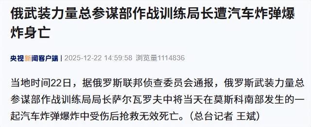 当地时间22日,据俄罗斯联邦侦查委员会通报,俄罗斯武装力量总参谋部作战训练局局长萨尔瓦罗夫中将当天在莫斯科南部发生的一起汽车炸弹爆炸中受伤后抢救无效死亡。