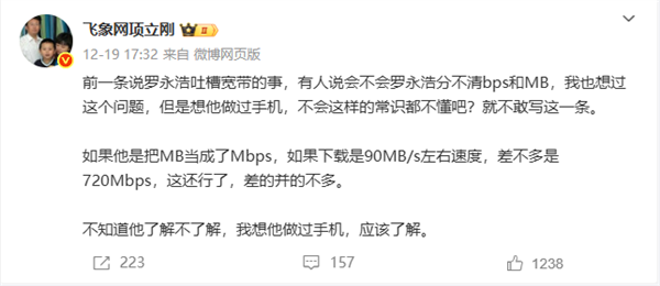 作为通信行业专家的项立刚提出几个问题:怀疑罗永浩分不清MB和Mbps单位,质疑家庭用不可能有每月3万的独享千兆宽带,推测是路由器问题,还补了句"做过手机不该缺这常识"。