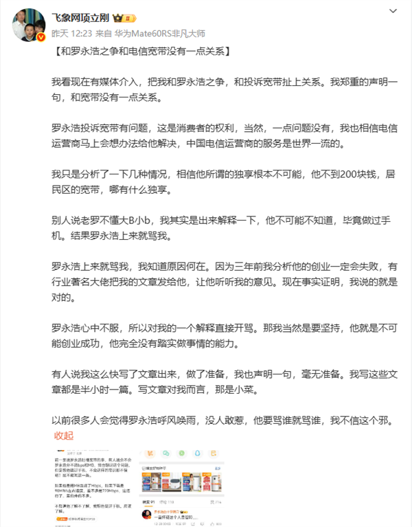 12月23日消息,昨日,项立刚再次回应与罗永浩的争执。