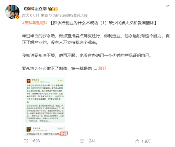 他更扬言要把罗永浩作为"创业失败"的典型案例分析,列出了从"缺少爱国情怀""缺乏技术理解"等六条"罪状"。