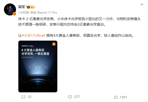 12月23日消息,雷军今日发文介绍了小米17 Ultra的徕卡2亿像素光学变焦。