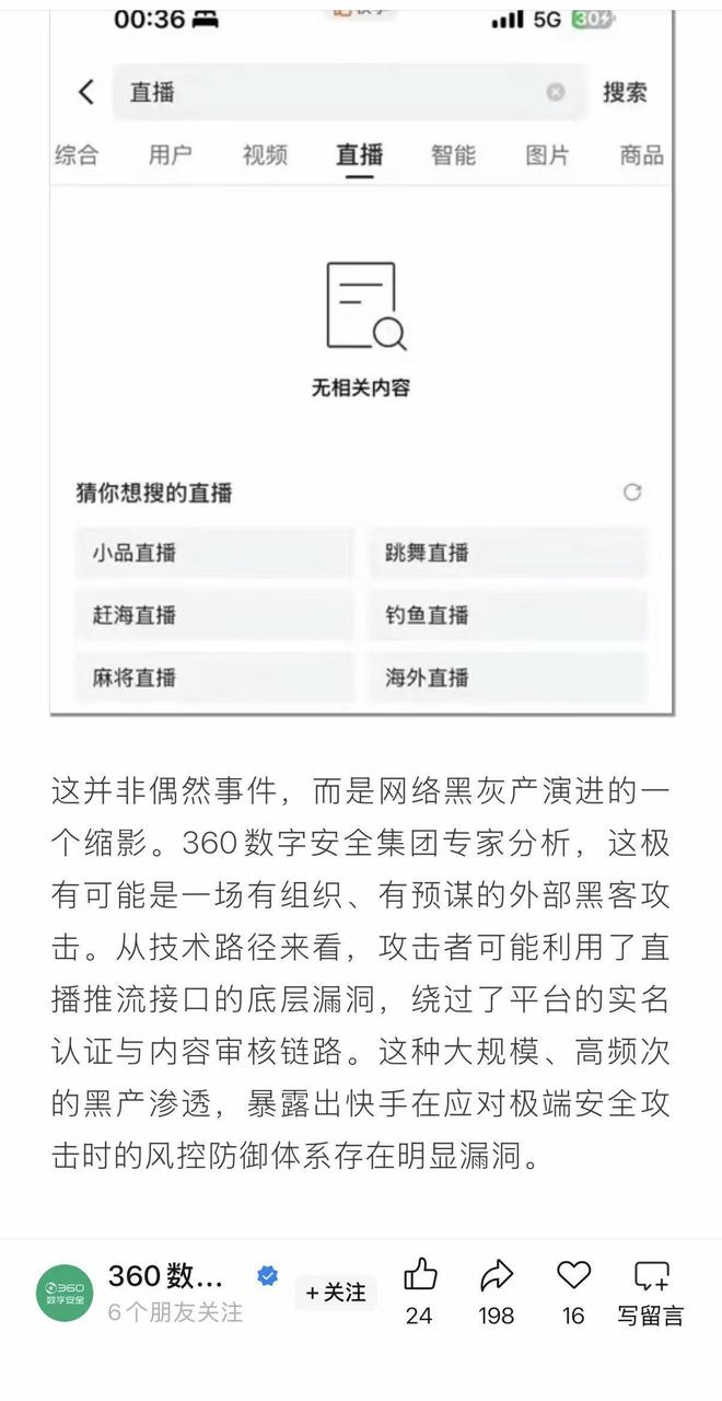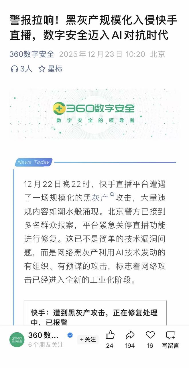今日,360数字安全官方账号发文复盘快手直播事故,称这是一场精心策划的AI化攻击。