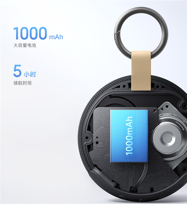采用2单元声学配置,搭载1.5英寸5W全频扬声器,内置大尺寸无源辐射器,配备1000mAh大电池,满电可播放5小时。
