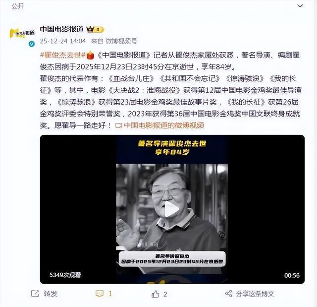 《中国电影报道》记者从翟俊杰家属处获悉,著名导演、编剧翟俊杰因病于2025年12月23日23时45分在京逝世,享年84岁。