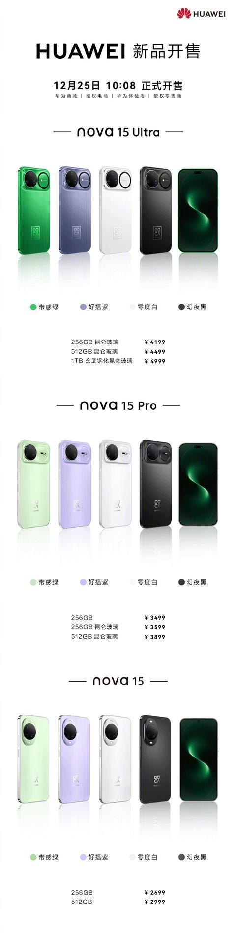 华为nova 15系列正式开售,包括标准版、Pro版和Ultra版,标准版售价2699元起,Pro版售价3499元起,Ultra版售价4199元起,该系列手机拥有出色的拍照性能和强大的处理器性能,同时设计时尚,适合年轻用户群体。