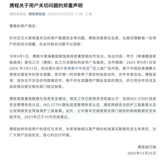 今年9月1日,携程与柬埔寨国家旅游局签署营销合作协议。协议内容:甲方(柬埔寨国家旅游局)委托乙方(携程)在乙方关联机构发布广告服务。合作期限:2025年9月1日至2026年3月31日。协议原计划于柬埔寨对华免签后上线广告内容,基于中国驻柬埔寨大使馆近期发布的安全提醒,我司第一时间暂停了原定的投放动作,合作未曾启动。携程承诺:该协议不涉及任何数据合作,绝不存在泄露用户隐私信息的情况,并已将合作协议及实际情况提交相关部门验证核查。