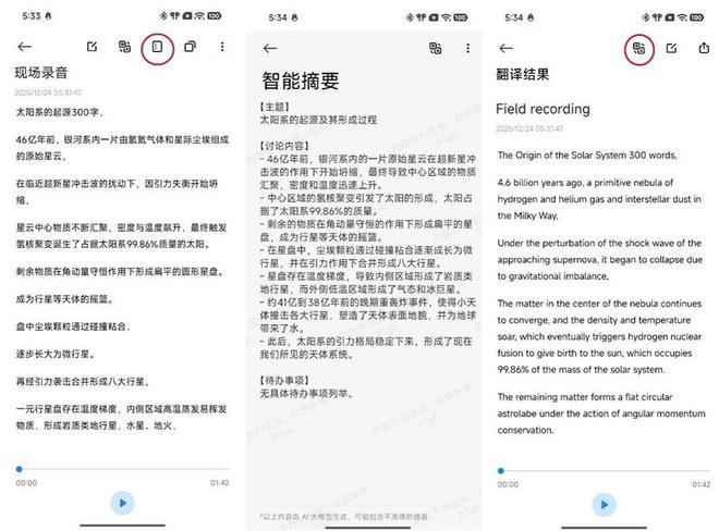 比如可以支持现场录音、通话录音,支持录音转文字生成会议记录,也能实时进行现场中英文转译。