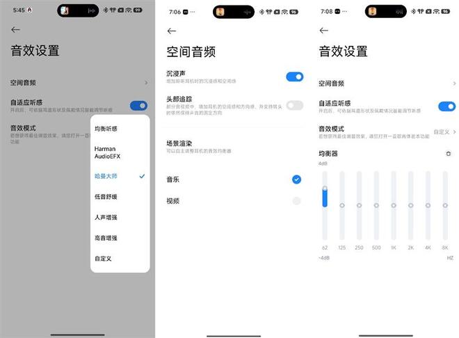 Xiaomi Buds 6具备自适应听感和自适应音量功能,有六种音效模式可选,默认是Harman AudioEFX。