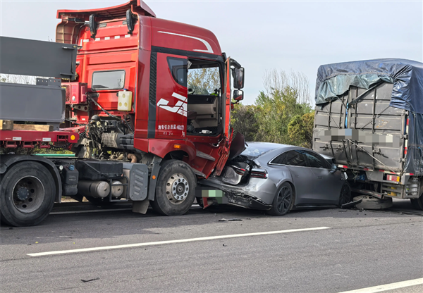 近日,据,一位智界S7车主在社交平台分享惊险遭遇。车主称驾驶智界S7跟随前方厢式货车行驶时,被一辆载重很大的大货车追尾。从现场图片看,智界S7被夹在两辆大货车中间,前后均受撞击损坏严重,基本报废。两辆货车受损相对较轻,但前面的厢货车后方变形,底部备胎被挤掉。